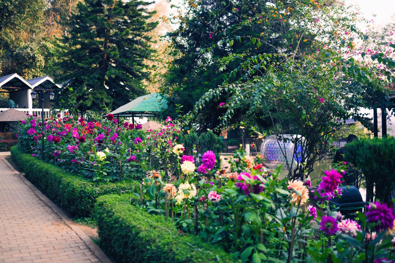 Entertainment: Shops, bar, salon, garden, and gift shop.