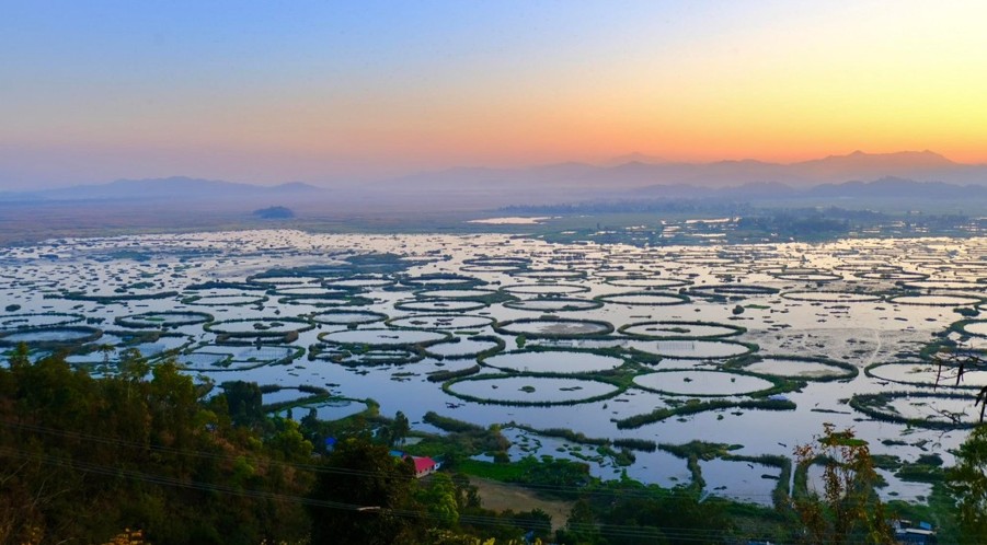 The main Loktak viewpoint near Moirang town offers the most accessible and panoramic view of the lake’s phumdi landscape — a wide observation deck above the lake surface with the floating mats stretching to the distant hills. Dawn and dusk are the finest times, when light rakes across the water and phumdi surfaces in vivid horizontal bands.