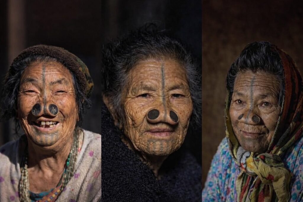 Traditional facial tattoos and nose plugs: Older Apatani women traditionally wore facial tattoos and large nose plugs (yaping hullo) as a mark of tribal identity. According to oral tradition, this practice was adopted to make Apatani women less attractive to raiders from neighbouring tribes. The practice has been discontinued among younger generations but elderly women carrying these markings are still present in the villages.